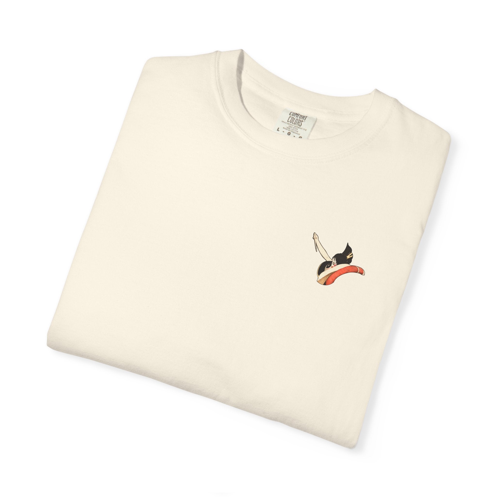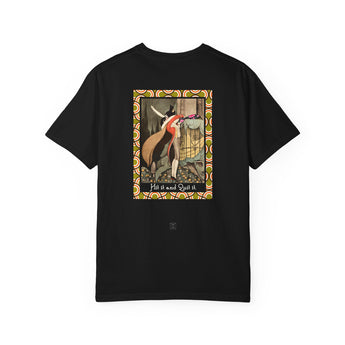 This shirt features a 1929 illustration by Gerda Wegener from "Sur Talons Rouge" (On Red High Heels). Her art is known for blurring the lines of gender and sexual expression. Wegener was the partner of artist Lili Elbe. Their story was adapted into the film "The Danish Girl", where Wegener was portrayed by Alicia Vikander.