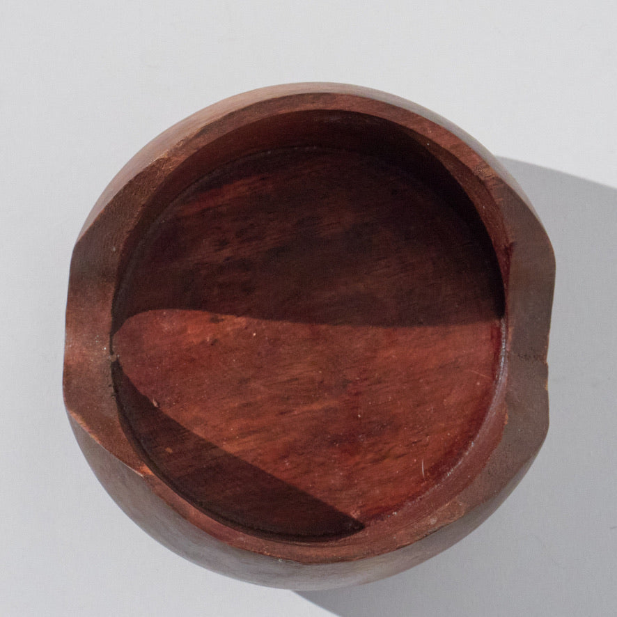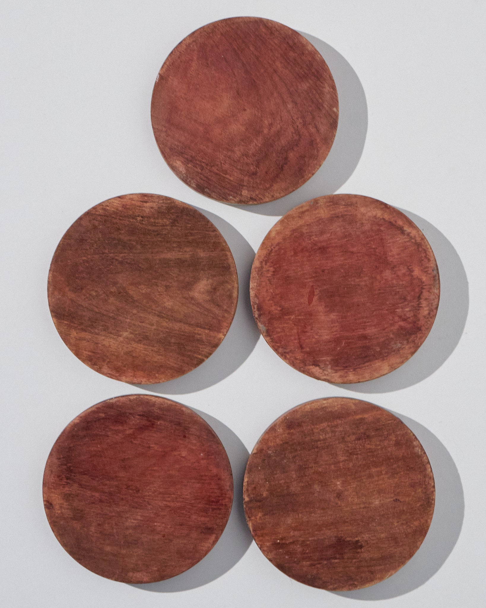 Crafted during the 1960s–1970s, this set embodies rustic and bohemian aesthetics, blending function with art. The warm wood tones and detailed carvings make it an attractive addition to a bar cart, coffee table, or living room display. The coasters not only serve a practical purpose in protecting surfaces but also double as decorative pieces that highlight traditional craftsmanship.