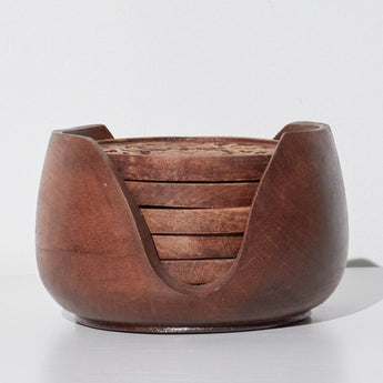 Set includes 5 coasters and 1 matching carved wood holder (6 pieces total)