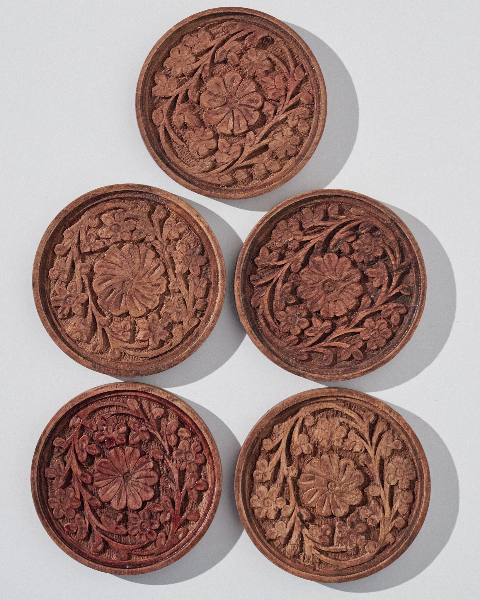Rustic Vintage Hand Carved Wooden Coaster with Holder Intricate Floral Carving 6 pc