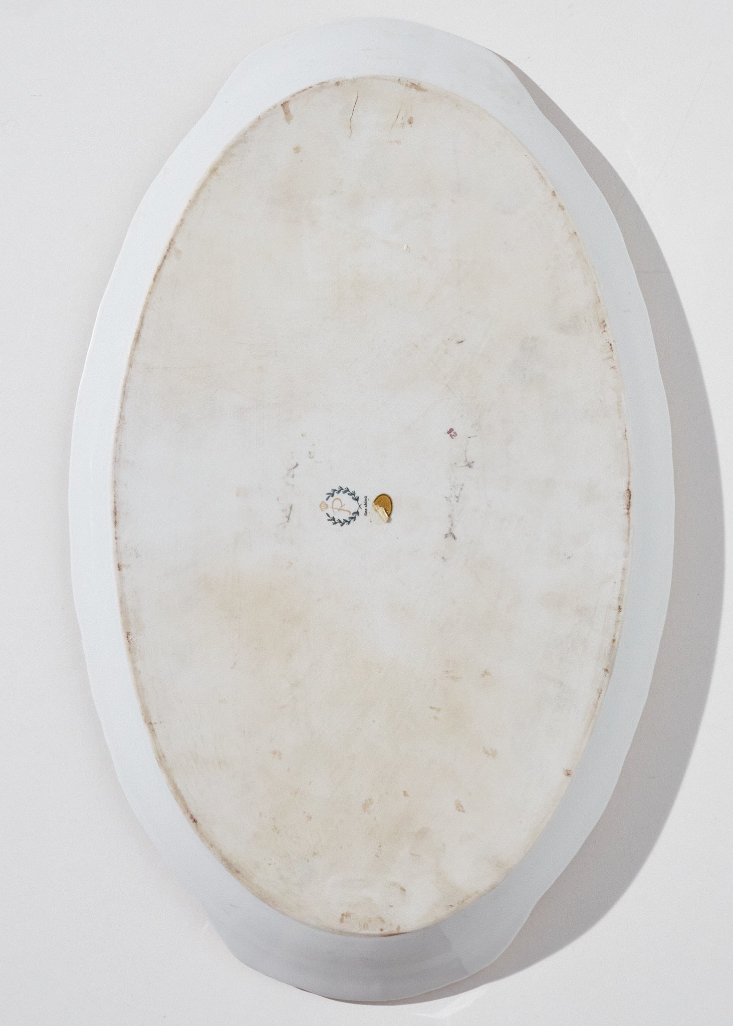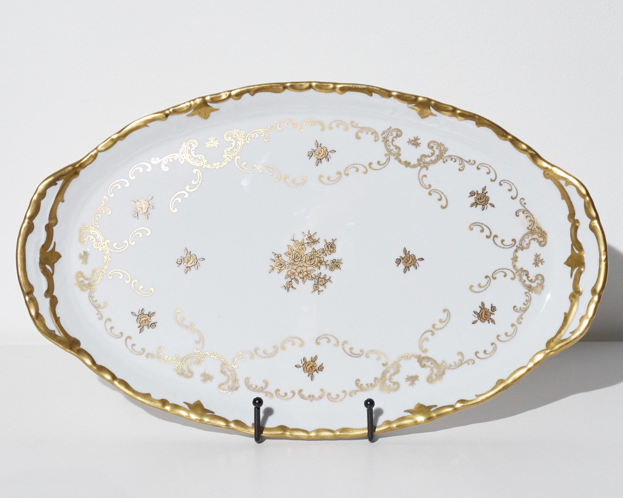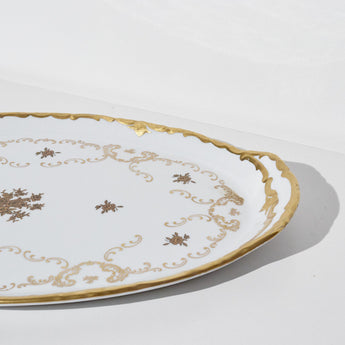 Style / Design Notes: Oval serving platter with scalloped rim, ornate floral gilt decoration, and central motif