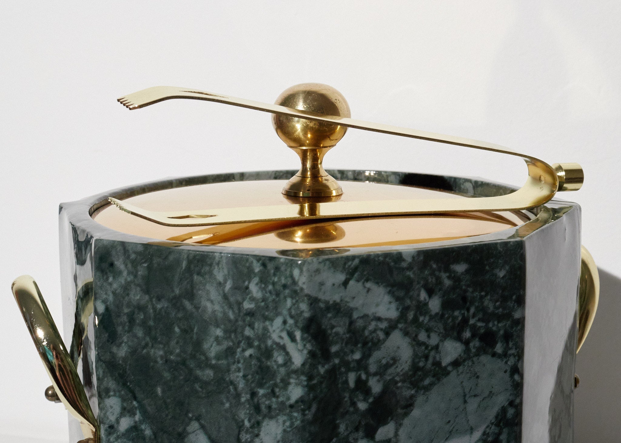 This vintage 1970s Hollywood Regency ice bucket captures the bold glamour of mid-century entertaining. Finished in a striking green faux malachite pattern with gleaming gold-tone brass details, it reflects the opulent style that defined the cocktail culture of the era.