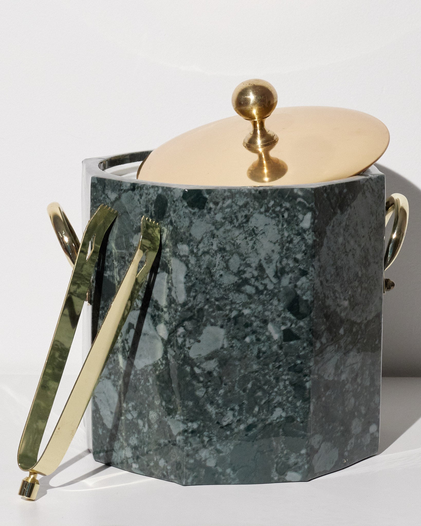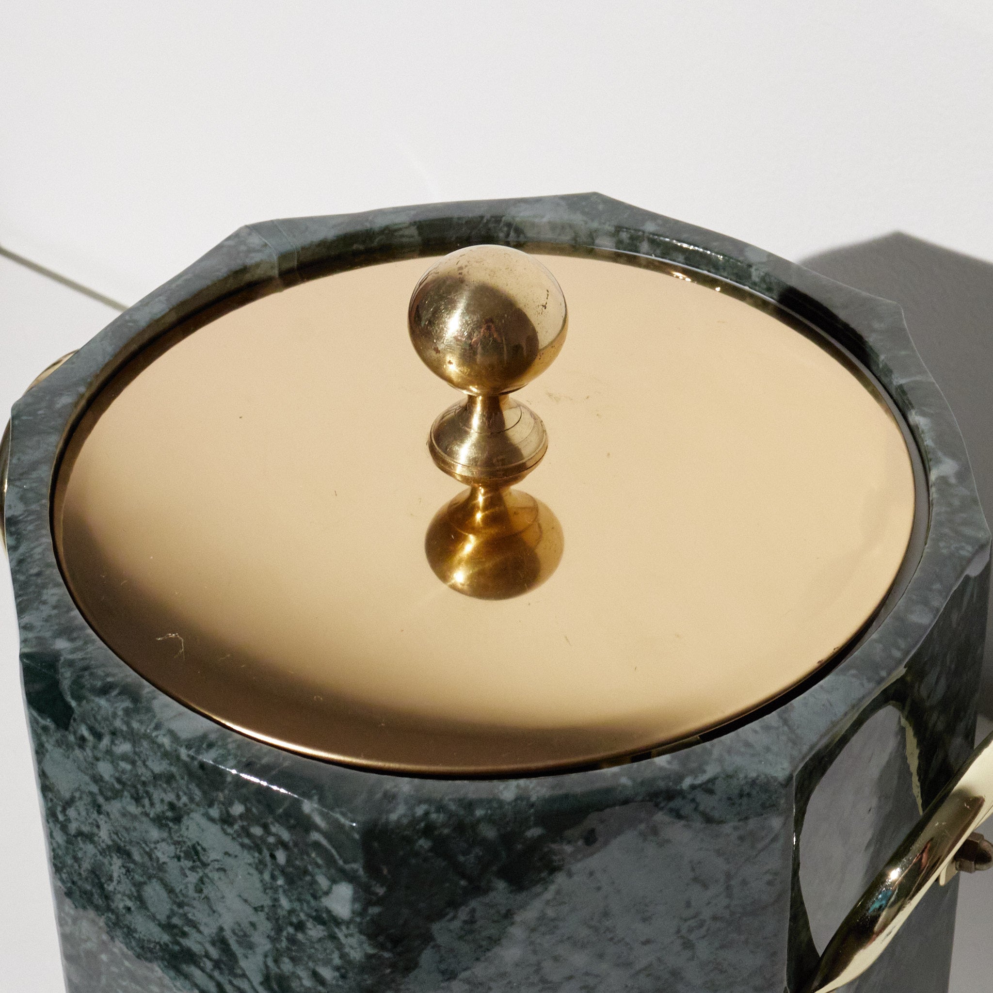 Style / Design Notes: Faux malachite surface, octagonal body, brass hardware, removable lid, matching tongs