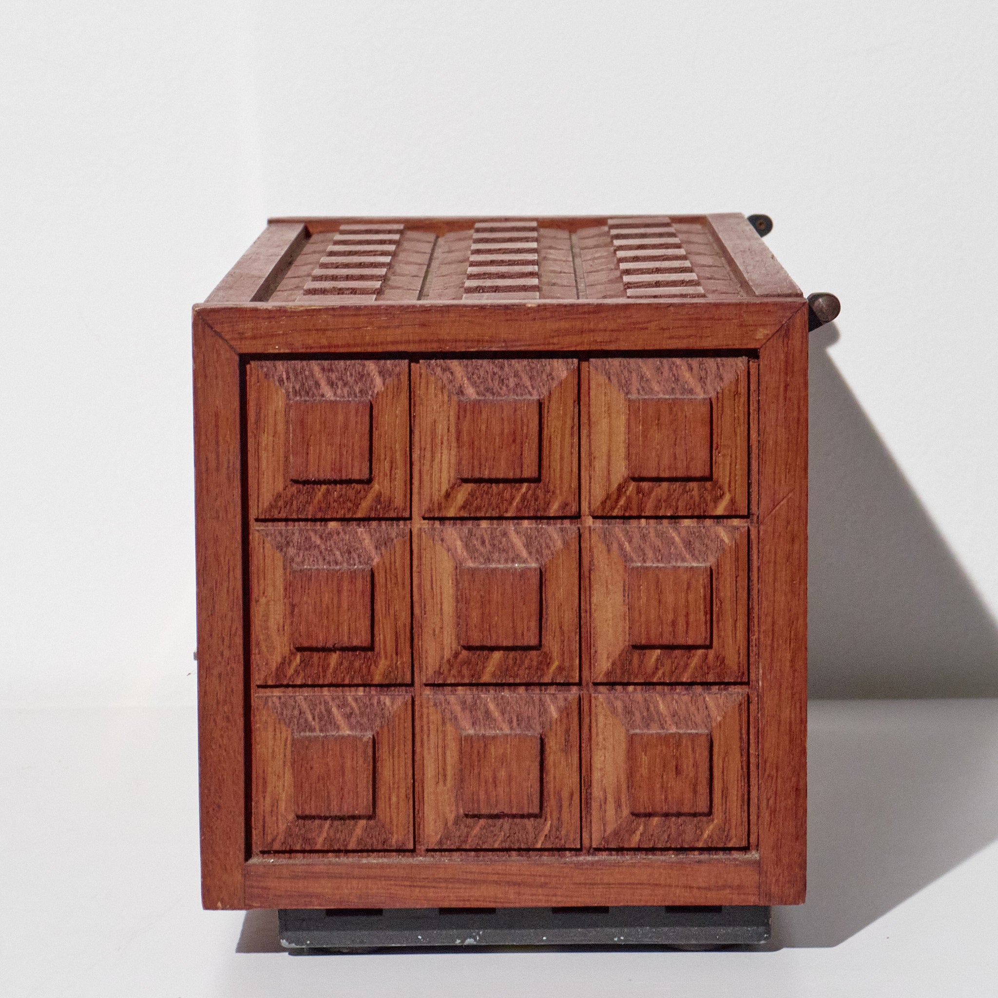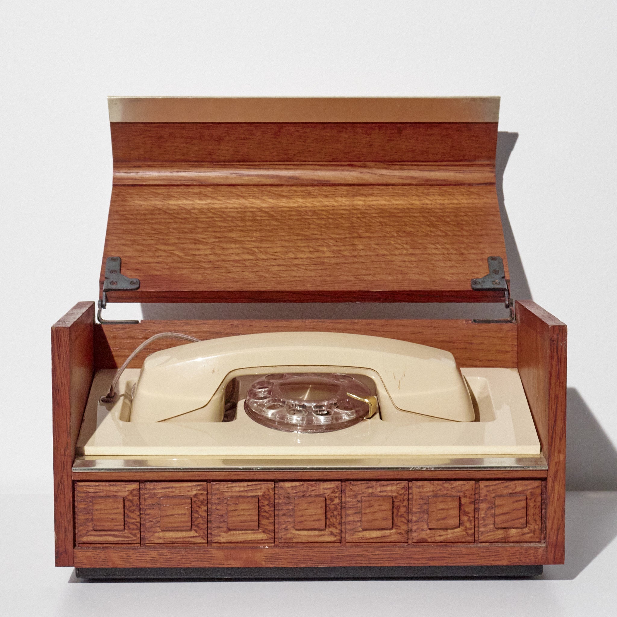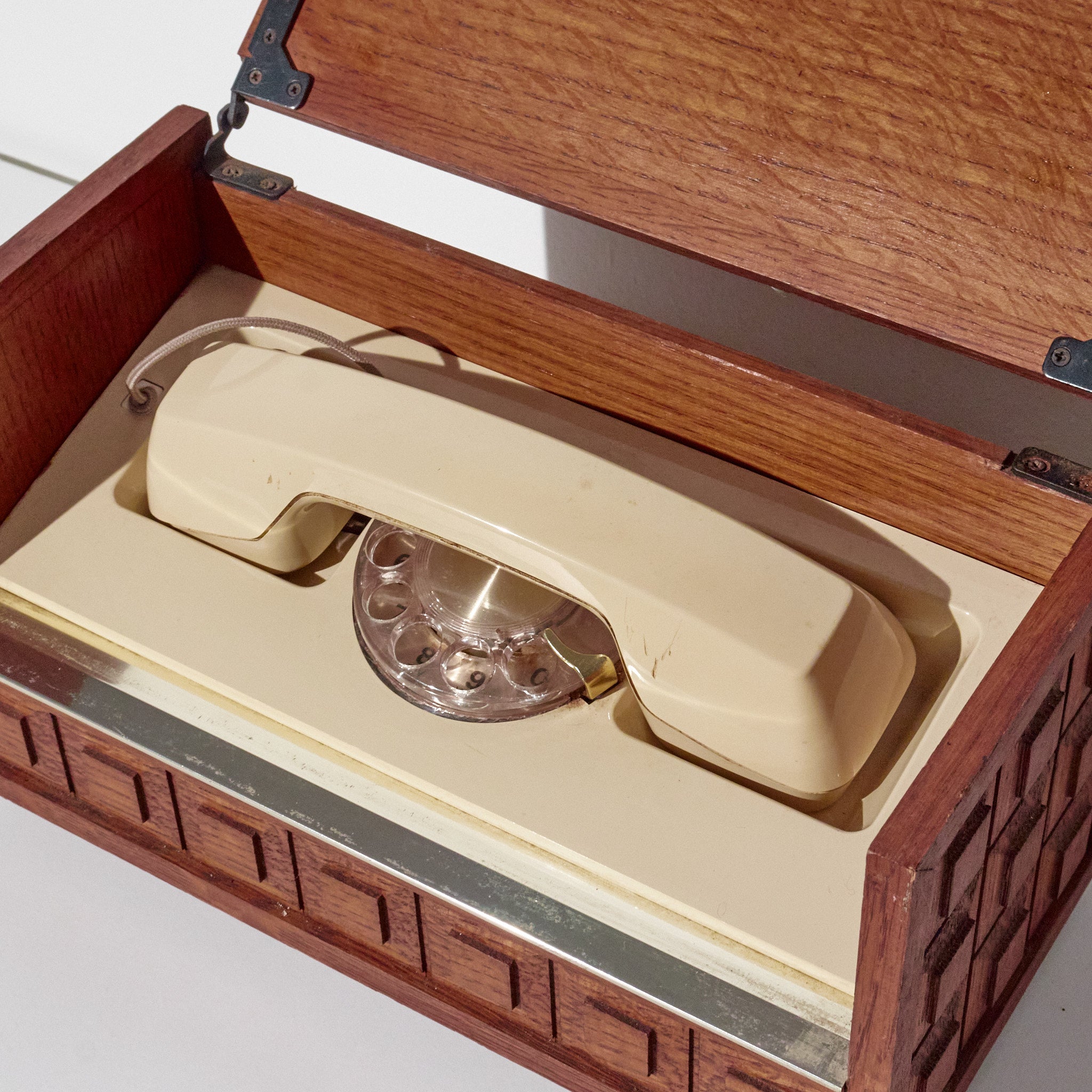 Style / Design Notes: Concealed rotary phone design; Mid-Century executive décor aesthetic; geometric carved box pattern