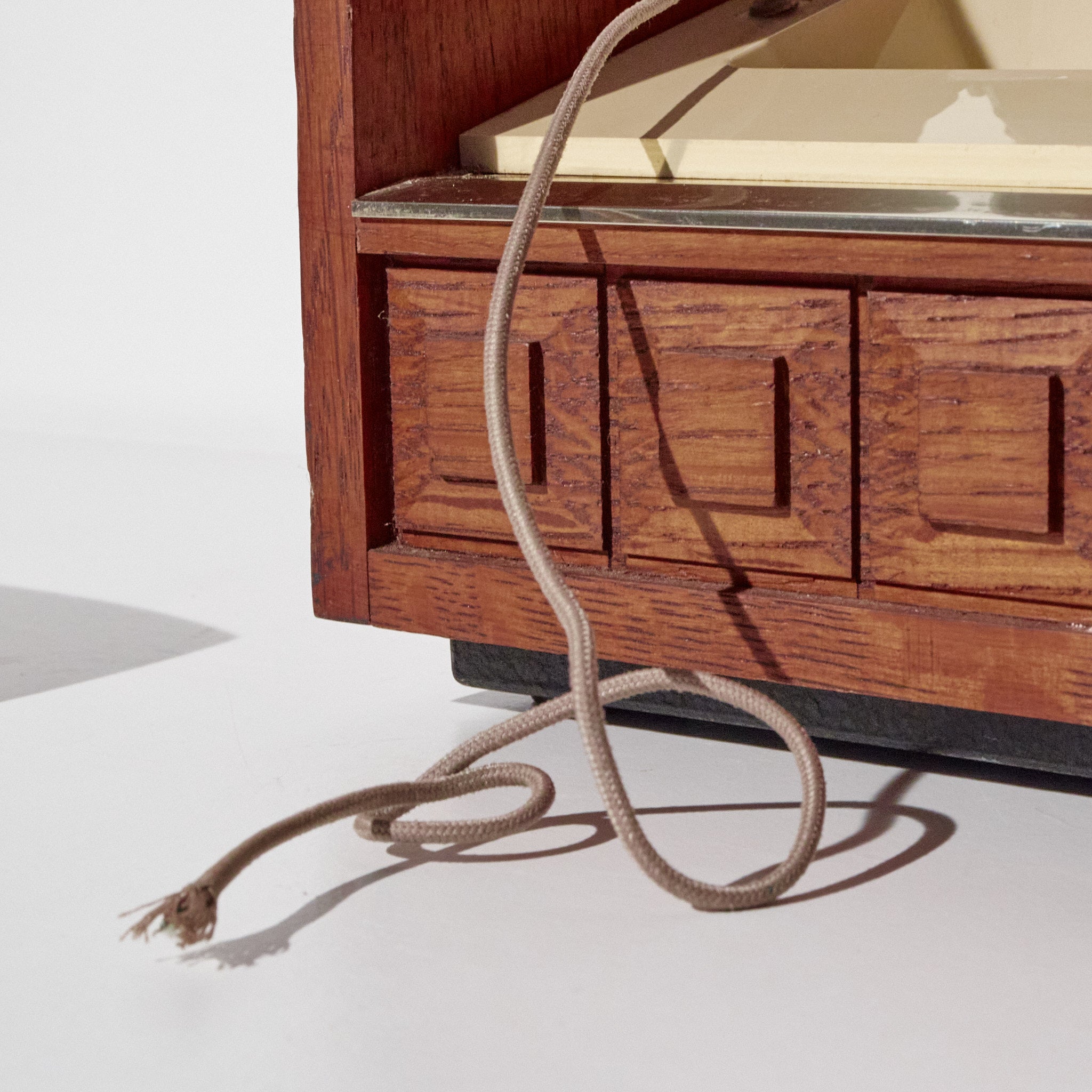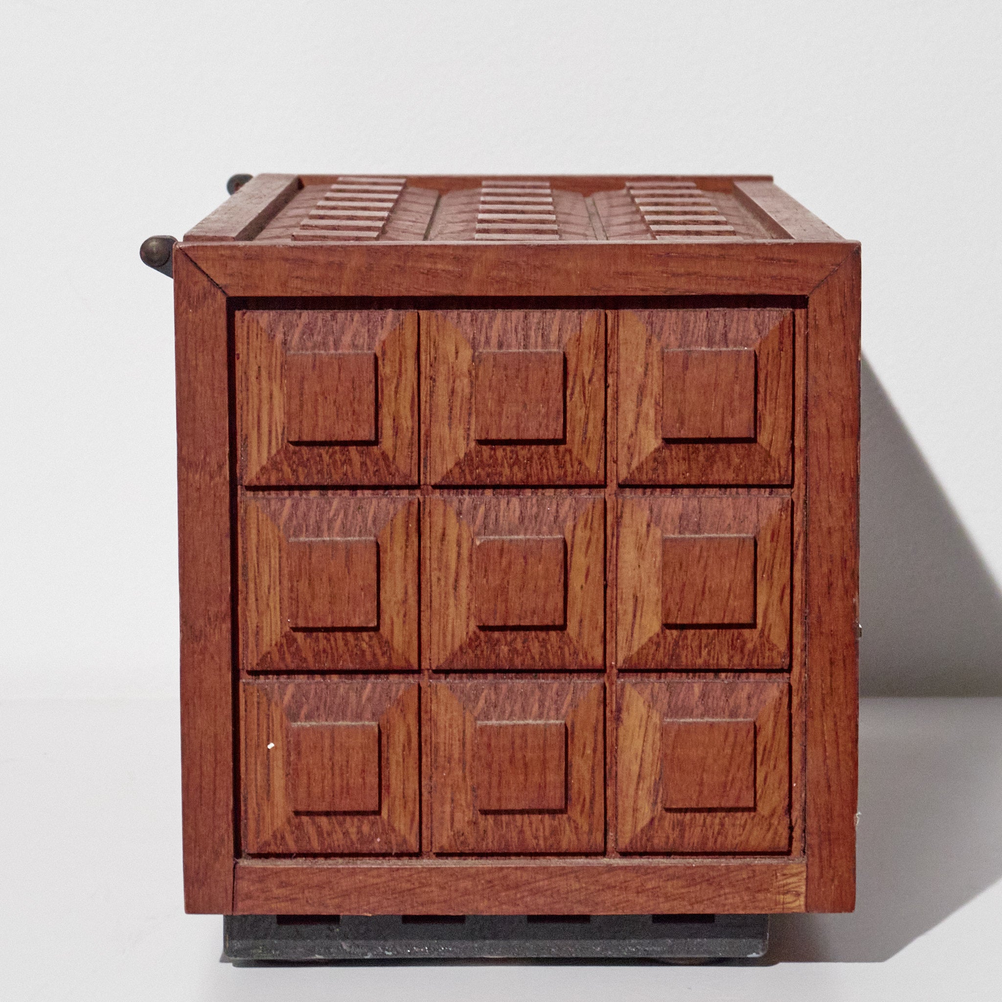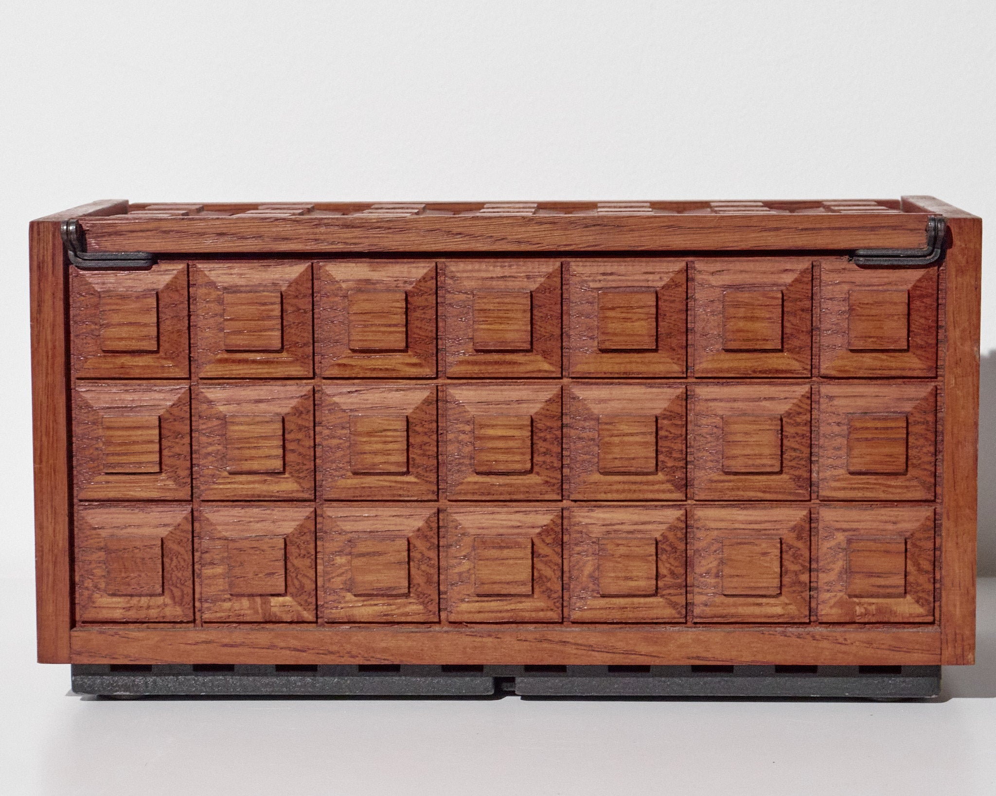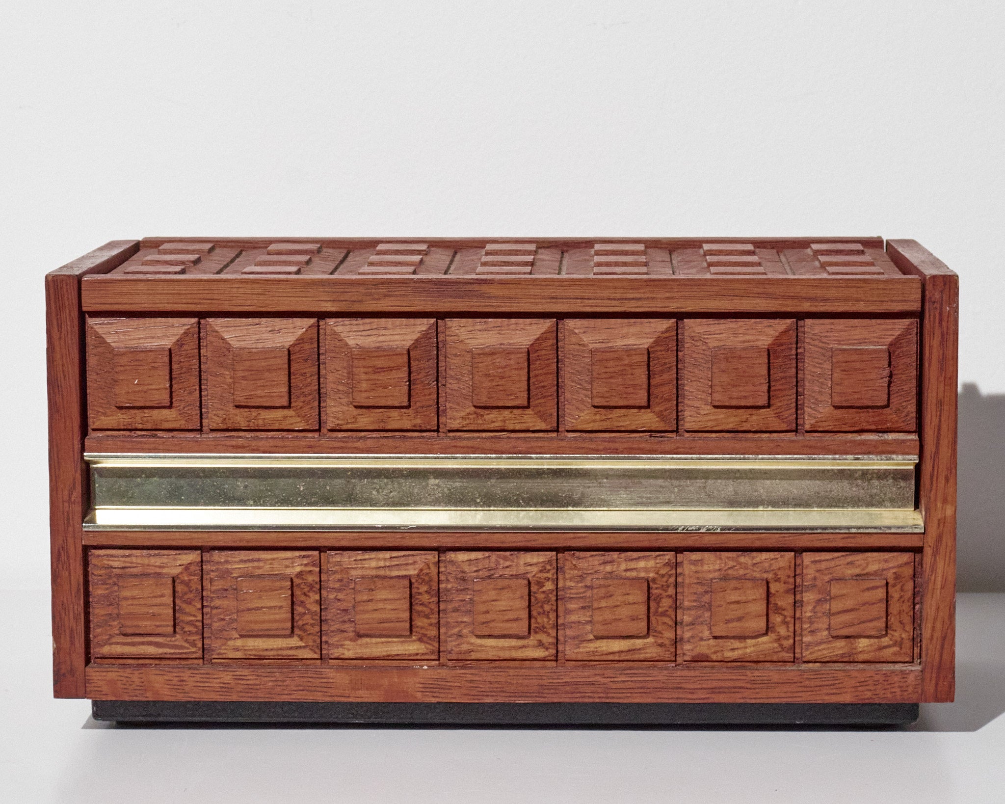 Style / Design Notes: Concealed rotary phone design; Mid-Century executive décor aesthetic; geometric carved box pattern