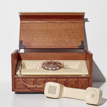 Produced by Western Electric, the manufacturing arm of AT&T and one of the most respected American telecommunications companies, the Stowaway series offered a luxury alternative to standard rotary phones. The walnut-tone wood cabinet, brass-tone accent, and cream rotary handset highlight the period’s focus on combining practicality with Mid-Century and executive office style.