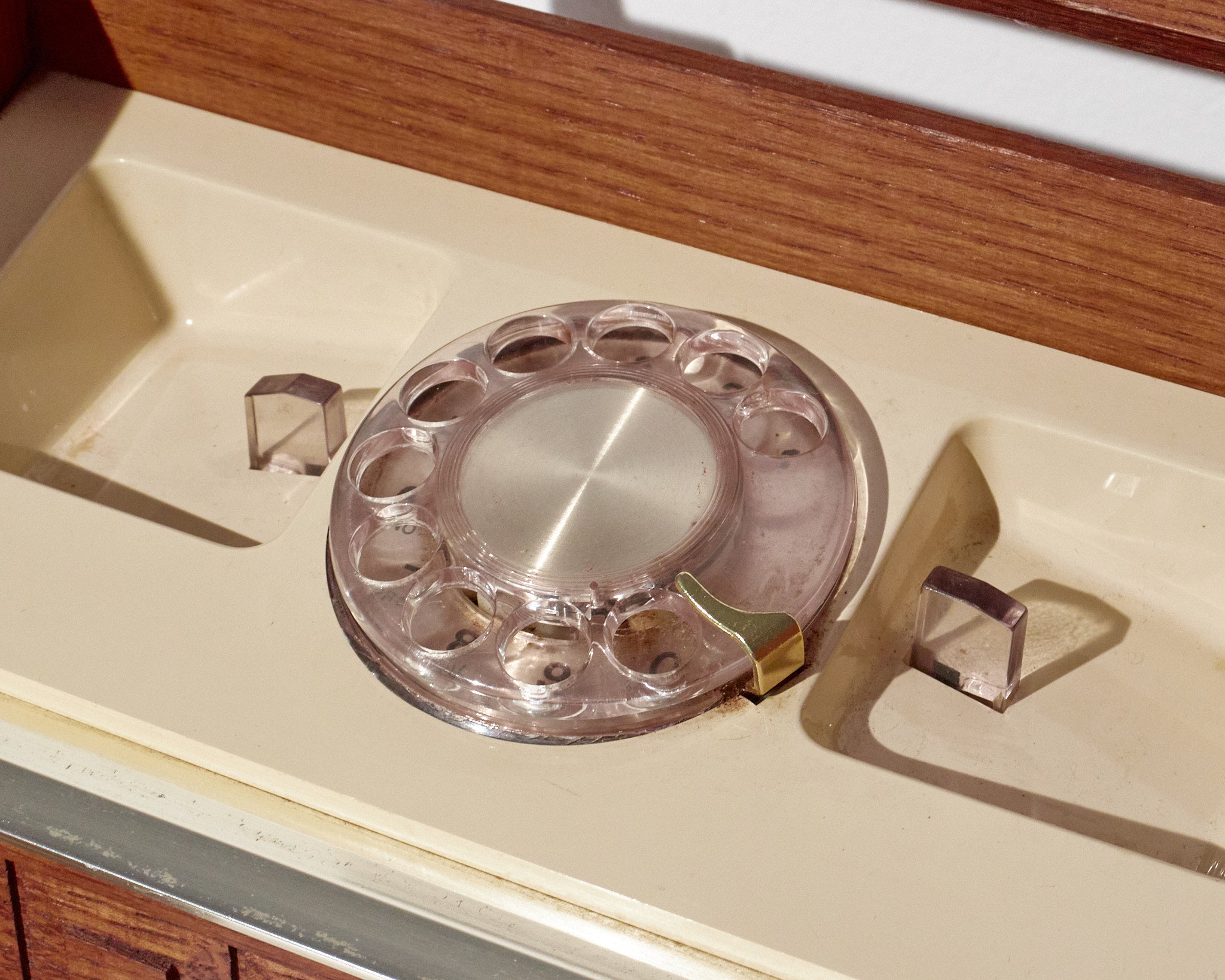 Concealed rotary dial phone in wood box cabinet