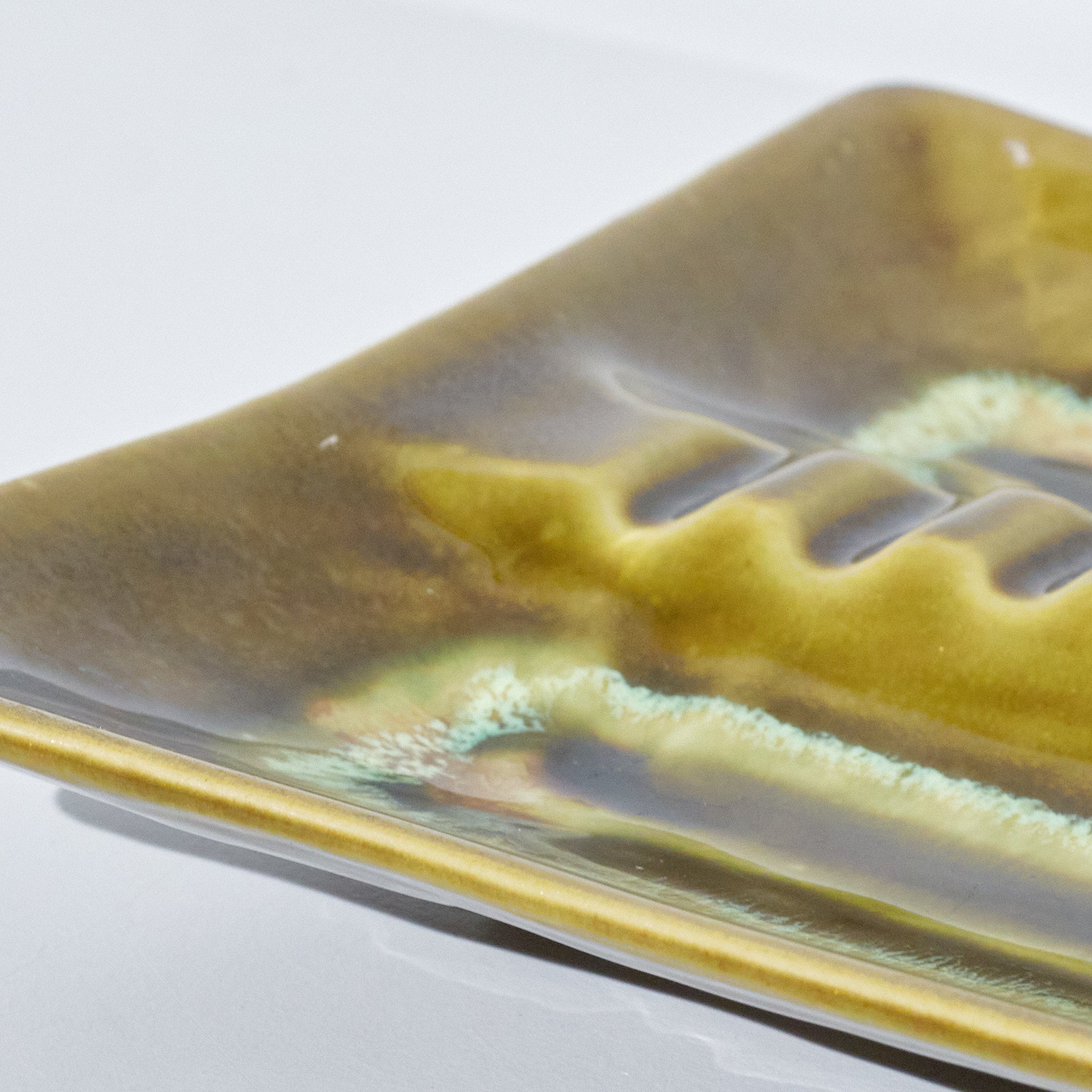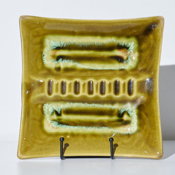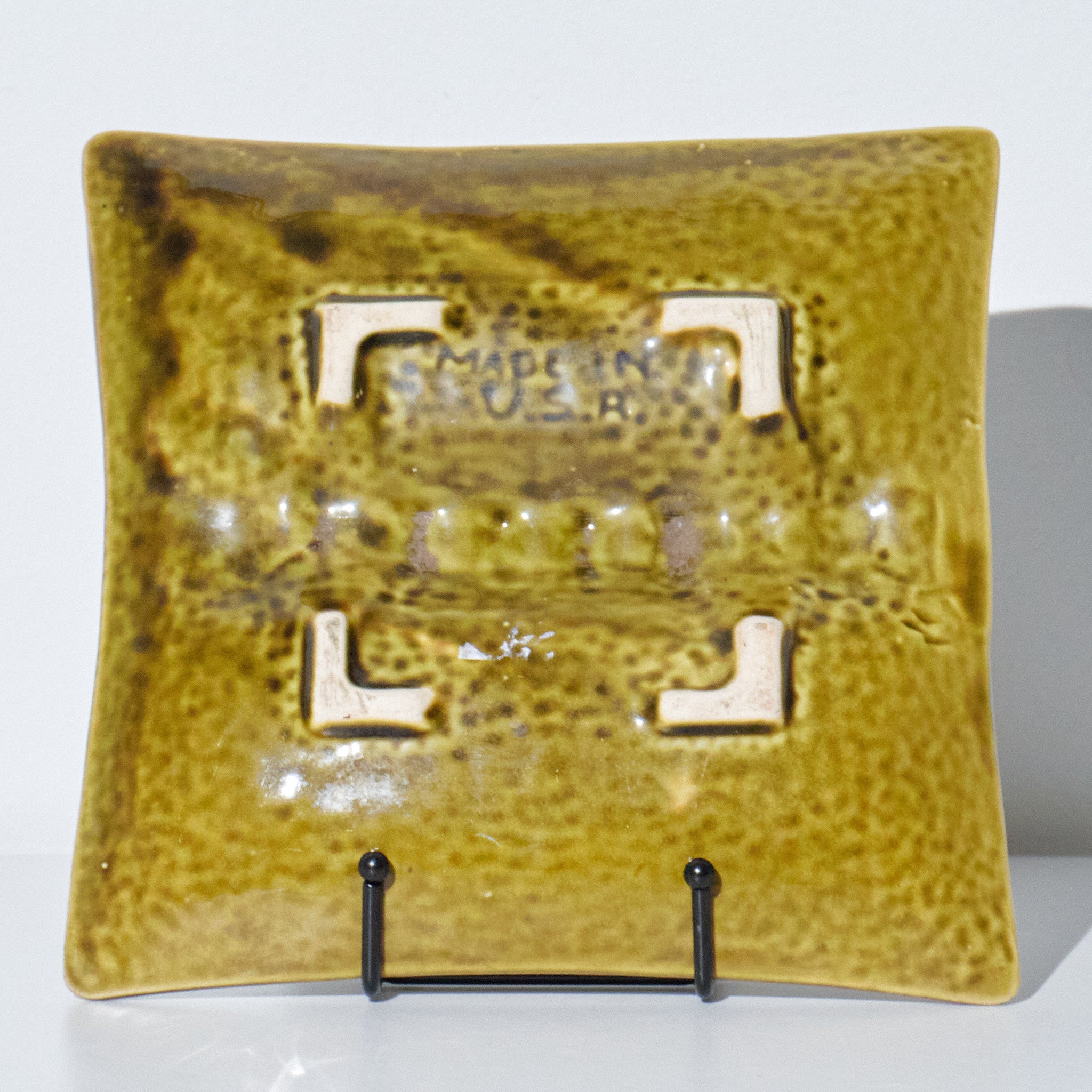 Gorgeous hard-to-find olive green midcentury ceramic square ashtray. Stamped "made in USA" on the bottom.