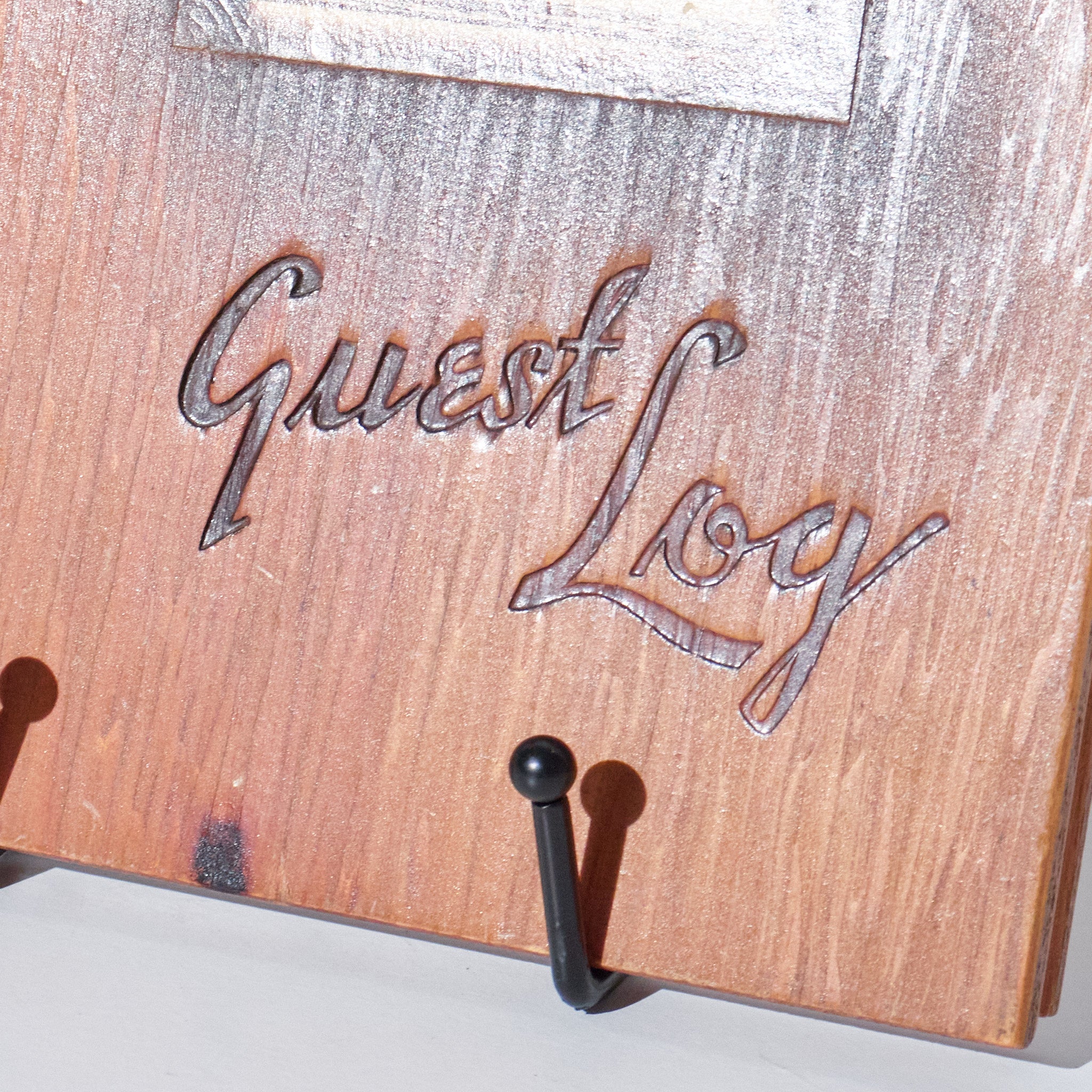 Nearly antique guest log used in hotels and boarding houses. Original filled in pages are gone, but blank pages remain for your usage. Has rawhide laced binding and brass hinges. "Rules of This Tavern" pasted down paper adorns the front of the log.
