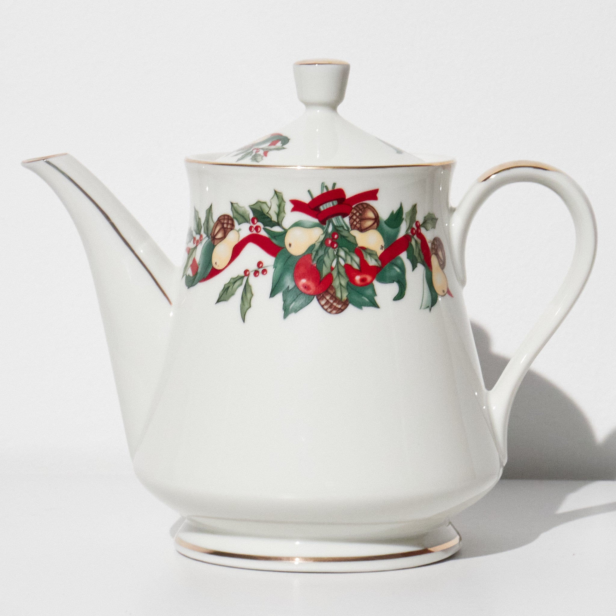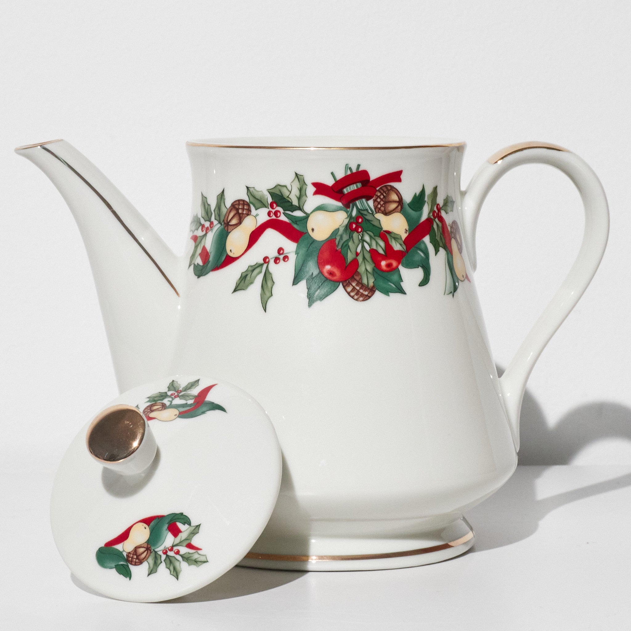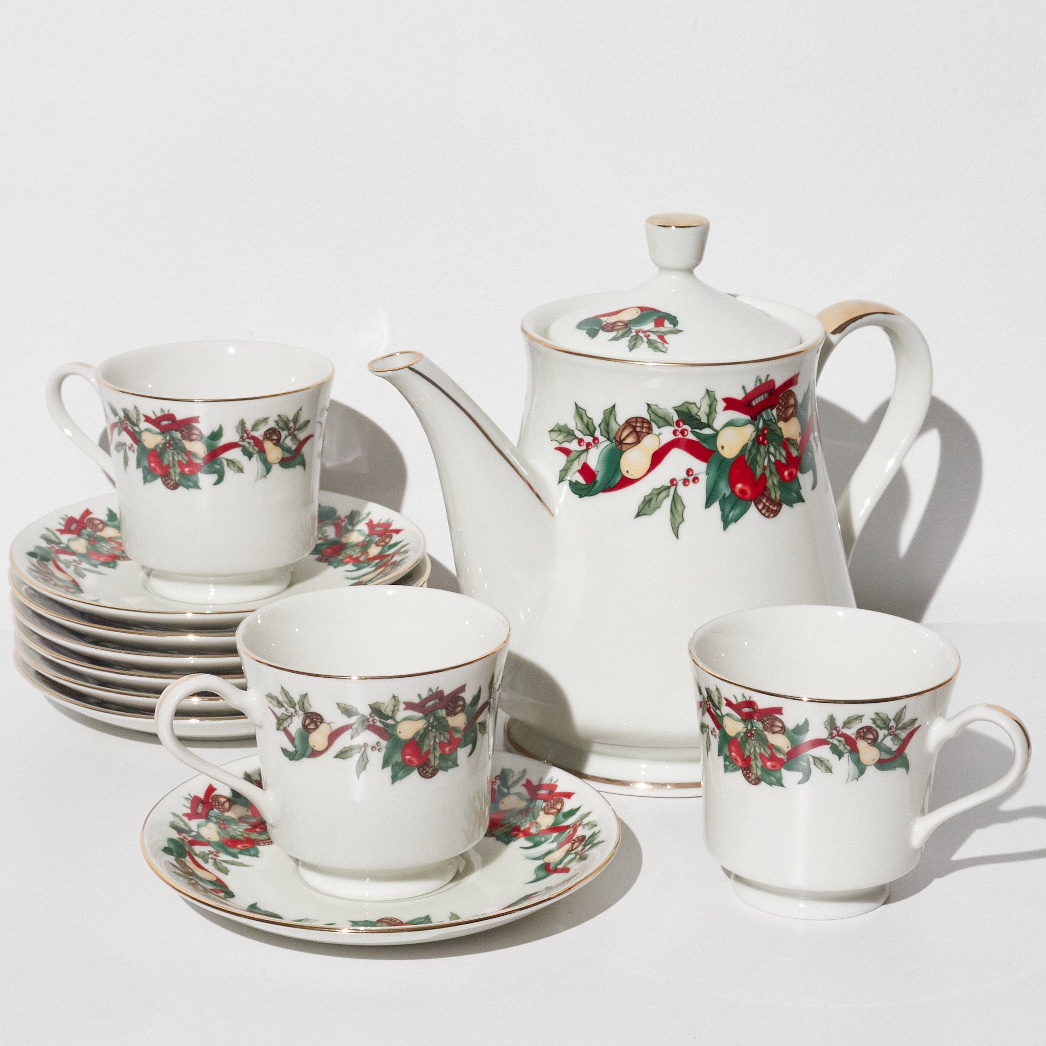 This vintage AMC Christmas Bounty tea set was produced in Japan and distributed through AMC New York. Featuring a festive holiday motif of holly leaves, red ribbons, pinecones, and fruit garlands, the design reflects classic late 20th-century Christmas tableware. Trimmed in gold along the rims and crafted from fine porcelain, the set embodies both elegance and seasonal warmth.