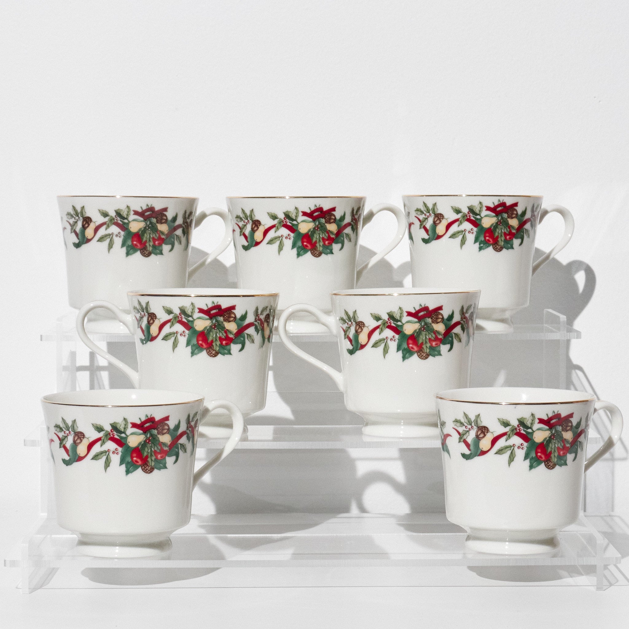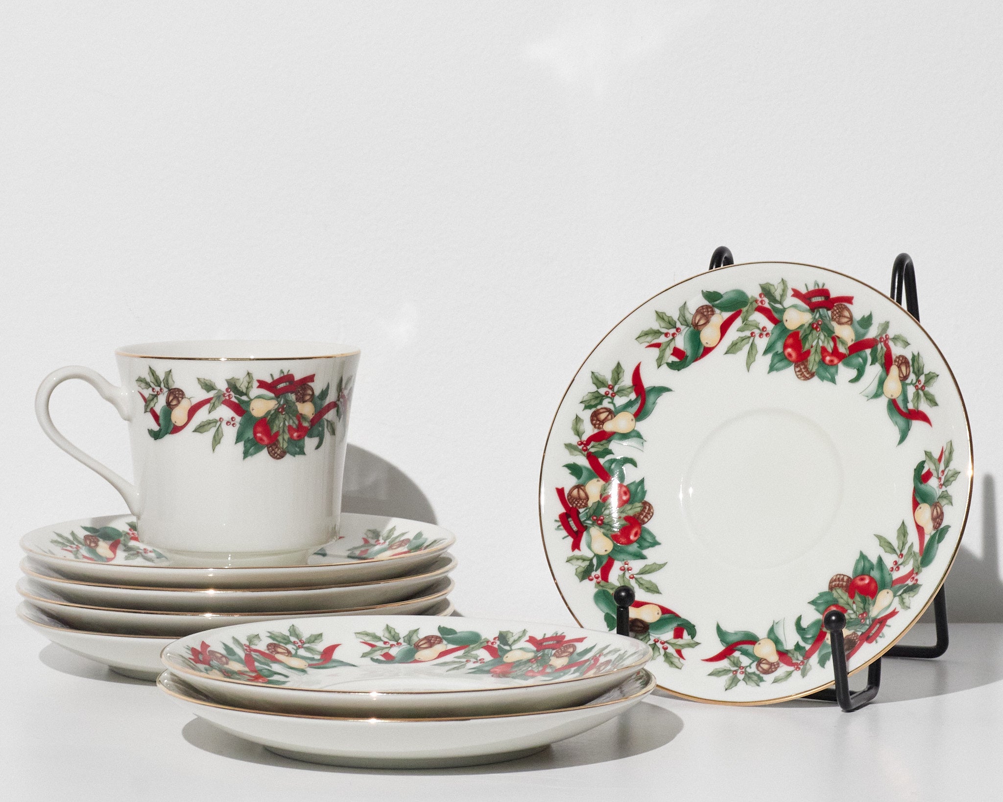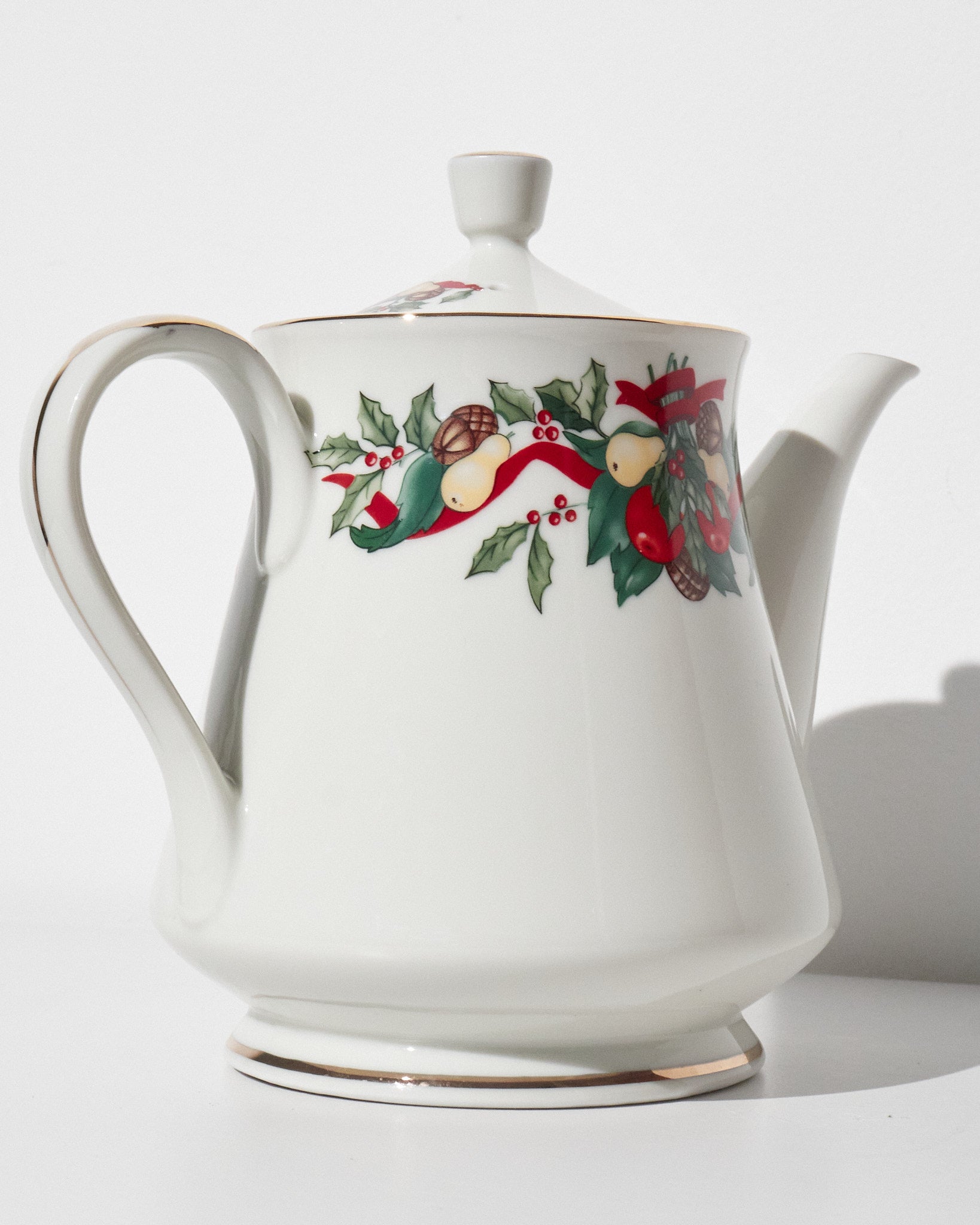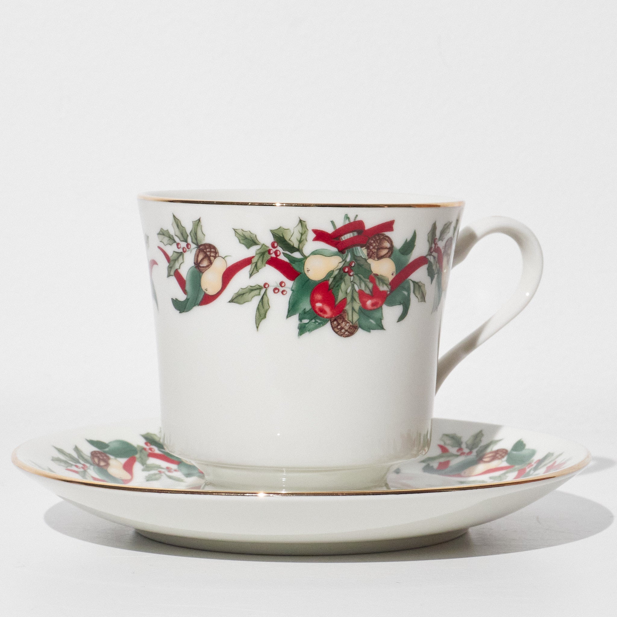 This vintage AMC Christmas Bounty tea set was produced in Japan and distributed through AMC New York. Featuring a festive holiday motif of holly leaves, red ribbons, pinecones, and fruit garlands, the design reflects classic late 20th-century Christmas tableware. Trimmed in gold along the rims and crafted from fine porcelain, the set embodies both elegance and seasonal warmth.