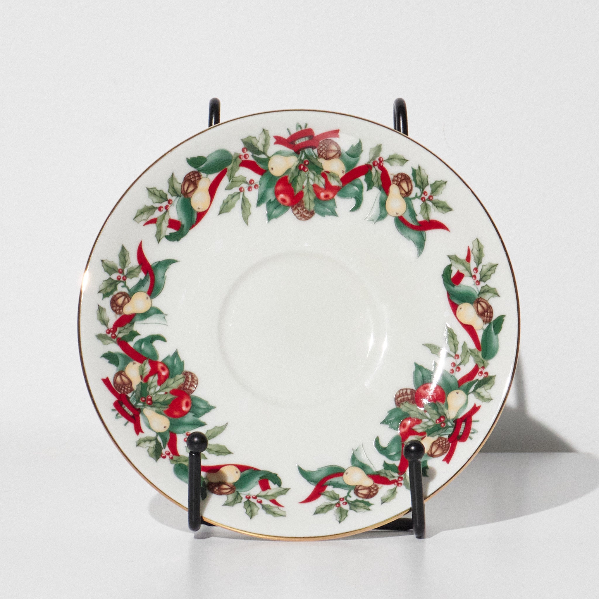 Style / Design Notes: Traditional holiday china, festive fruit and holly garland motif, gold-trimmed rims